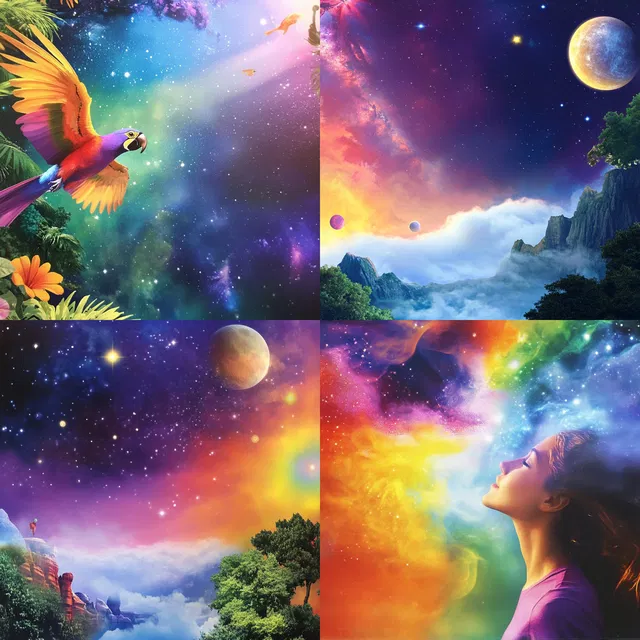 Этот стиль характеризуется яркими цветами и насыщенными текстурами, которые создают сказочную атмосферу в различных темах. Небесные и космические элементы гармонично сочетаются с мифическими и пасторальными мотивами, вызывая чувство удивления и очарования.