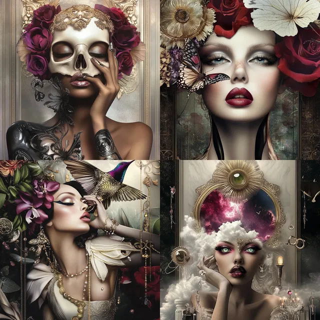 Роскошь и артистизм преобладают в этом направлении, акцент делается на сложных деталях и пышных украшениях. Насыщенные текстуры и яркие тона драгоценных камней создают ощущение роскоши и глубины. Стиль прекрасно передаёт мистические и фантастические темы, часто опираясь на влияние ар-нуво и символизма. Его сила заключается в способности создавать сказочную, сюрреалистичную атмосферу, хотя ему может быть сложно с фотореализмом в более реалистичных контекстах. Идеален для модных фотосессий класса люкс, брендинга премиум-сегмента и концептуального искусства, предлагая уникальное сочетание исторической и современной эстетики.
