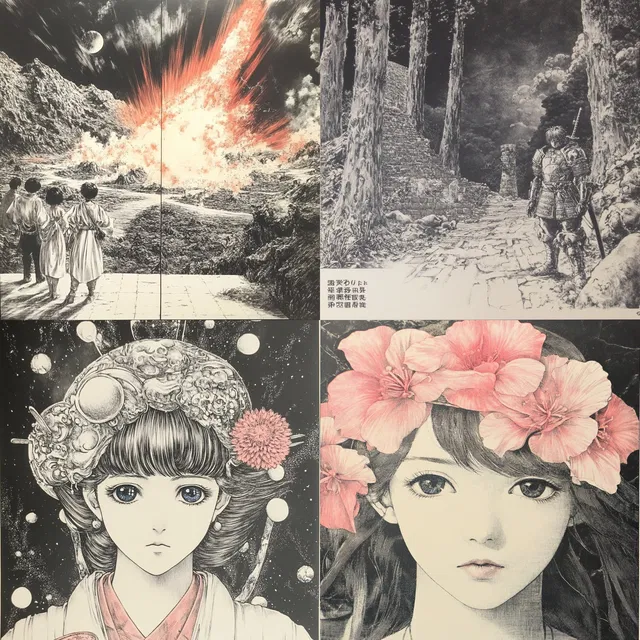 Этот стиль отличается поразительным сочетанием замысловатых линий и доминирования монохромной палитры. Он передаёт богатую повествовательную глубину на разнообразные темы.