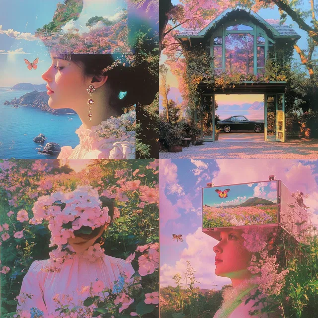Эфирные пейзажи снов создают сюрреалистичную и романтическую атмосферу благодаря своим пастельным цветовым палитрам и сложным многослойным композициям. В этом стиле гармонично сочетаются элементы природы, фэнтези и ностальгии, создавая сказочное настроение, одновременно причудливое и поэтичное.