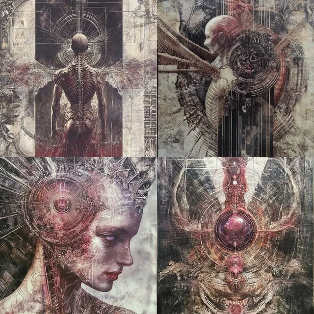 Этот стиль характеризуется замысловатыми деталями и фактурными наложениями, которые объединяют человеческие фигуры с механическими конструкциями в сюрреалистичной эстетике, вдохновлённой киберпанком. Геометрические узоры и симметричные рисунки создают сложные композиции, а приглушённые цвета и драматическое освещение — мистическую атмосферу.