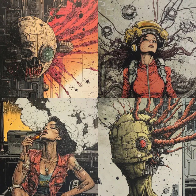 Этот стиль идеально подходит для графических романов, концепт-арта и редакционных иллюстраций. Он превосходно создаёт захватывающие дистопические миры. Однако ему может быть сложно передать фотореализм и более мягкие, органические объекты.