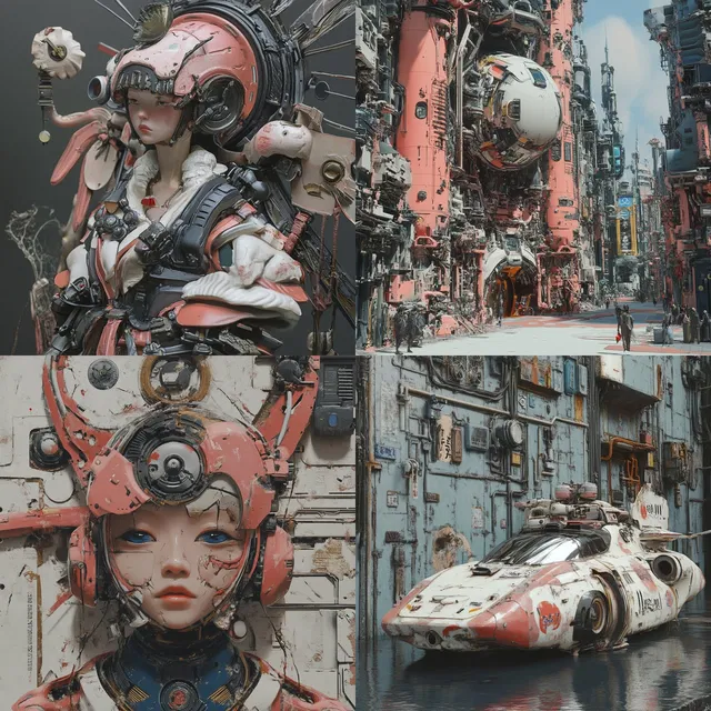 Сложные детали и механическая эстетика занимают центральное место, создавая сплав элементов киберпанка и футуризма. Этот стиль особенно хорош в изображении роботизированных фигур и городских пейзажей со сложной планировкой и многоуровневыми структурами. Приглушённая цветовая палитра дополняет детальные текстуры, вызывая ощущение технологического прогресса и городской антиутопии.