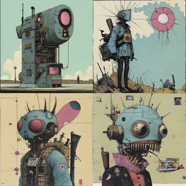 Этот стиль представляет собой уникальное сочетание ретрофутуристической эстетики и механического сюрреализма. Он особенно хорош для иллюстрации сложных индустриальных пейзажей и роботизированных фигур. В нём используются приглушённые пастельные тона и высокий контраст, чтобы подчеркнуть детальные текстуры и плоскую штриховку.
