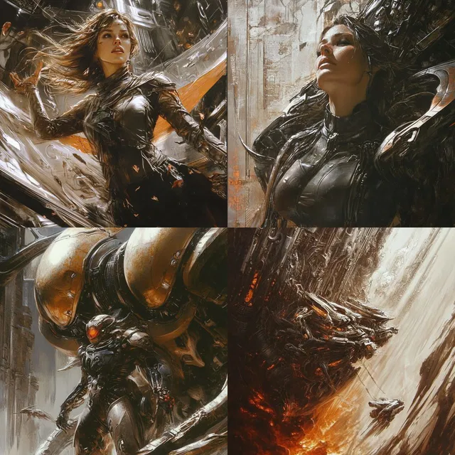Футуристическая механика завораживает своими динамичными композициями и замысловатыми деталями, ярко раскрывая темы механизмов и технологий. Стиль отличается способностью передавать футуристическую эстетику с особым вниманием к механическим мотивам и индустриальному дизайну. Визуальные особенности стиля — это высокий контраст и резкое освещение, которые подчёркивают металлический блеск и отражающие поверхности.