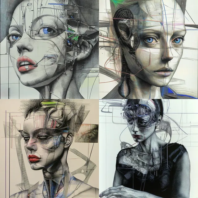 Замысловатые линии и сюрреалистичные композиции определяют этот стиль, объединяя механическую эстетику с футуристическими темами. Детальные текстуры и кибернетические элементы создают технологическую атмосферу, напоминающую работы Х. Р. Гигера и Сида Меда.