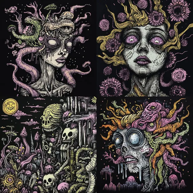 В этом стиле преобладают замысловатые линии и яркие цветовые палитры, которые создают психоделическую и сюрреалистичную атмосферу. Использование смелых, контрастных цветов усиливает детальные и сложные композиции, в которых часто переплетаются органические и механические элементы.