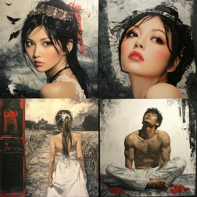 Использование насыщенных, ярких цветов и контрастного освещения наполняет каждое произведение драматизмом и интенсивностью. Композиции с фактурами и наслоениями предлагают богатство тактильных ощущений, а включение культурных мотивов и традиционных элементов добавляет глубины и контекста.