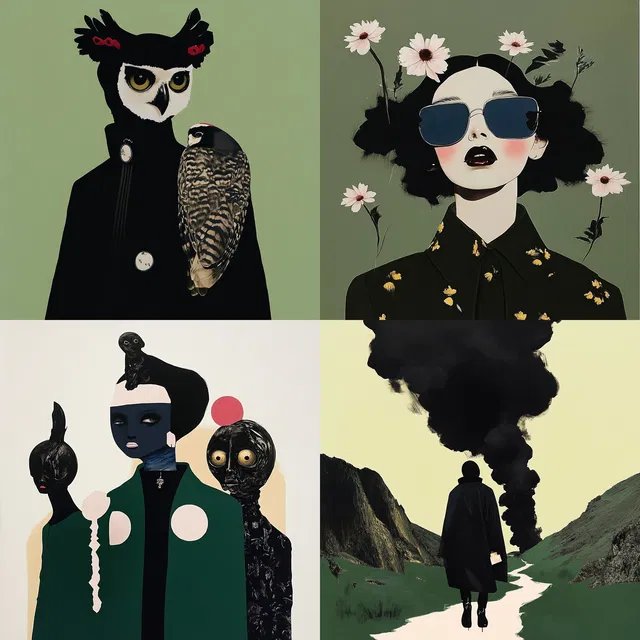 Этот поразительно сюрреалистичный и сказочный стиль очаровывает своими символическими и знаковыми образами. Использование приглушённых цветов и высокого контраста создаёт неземную атмосферу, а чёткие линии и гладкие поверхности придают изысканность и современный вид.