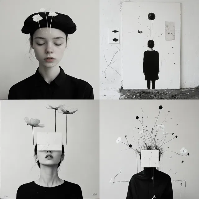 Монохромная элегантность доминирует за счёт резких контрастов и минималистичных форм. Геометрическая абстракция и линейная точность создают безмятежную, неземную атмосферу. Стиль отличается умением передать простоту и изысканность, напоминая о влиянии супрематизма и Баухауса. Хотя его сила заключается в концептуальной ясности и визуальной чистоте, ему может не хватать глубины в фотореалистичных контекстах.