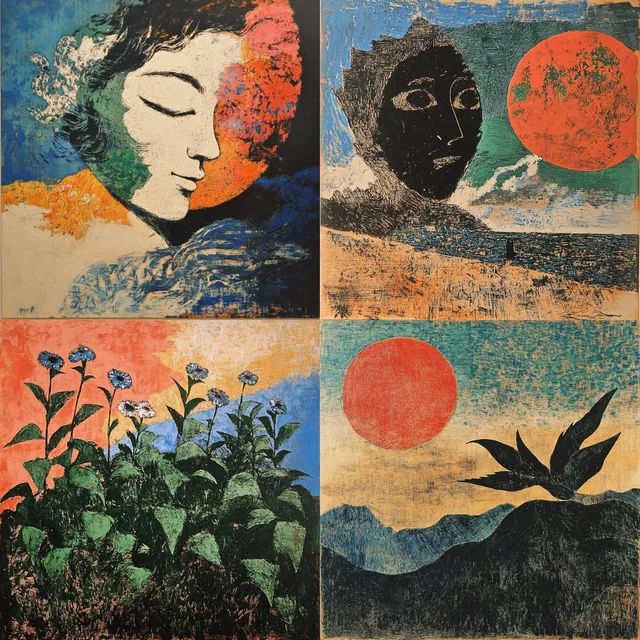 Изображаемые объекты варьируются от элементов природы и человеческих фигур до городских и архитектурных форм, отражая темы человеческих эмоций, взаимодействия с природой и урбанистического футуризма.