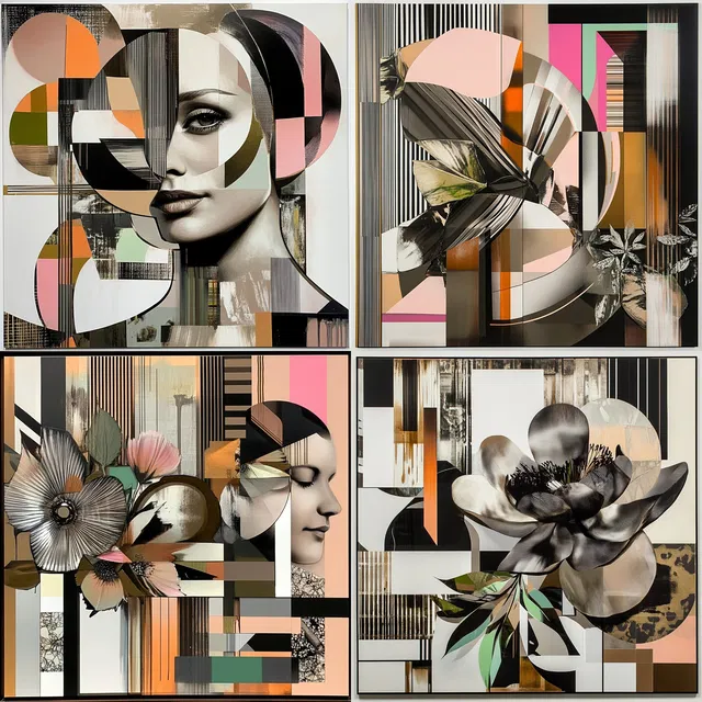 Геометрическая абстракция преобладает благодаря динамичному взаимодействию многослойных текстур и смелых контрастов. В этом стиле чувствуется сильное влияние кубизма: раздробленные формы сочетаются с современной элегантностью, которая перекликается с разными темами.