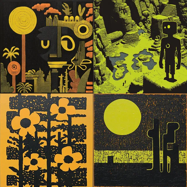 В этом стиле преобладает геометрическая абстракция и текстурная глубина. Для создания яркого визуального эффекта используется монохромная палитра жёлтого и чёрного цветов.