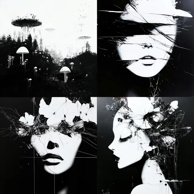 Этот стиль — яркое исследование монохроматической абстракции. Он отличается созданием высококонтрастных визуалов, в которых сюрреалистичные элементы сочетаются с концептуальной глубиной. Использование чётких разграничений и замысловатой прорисовки линий приводит к динамичному взаимодействию форм, часто вызывающему ощущение сказочной неопределённости.