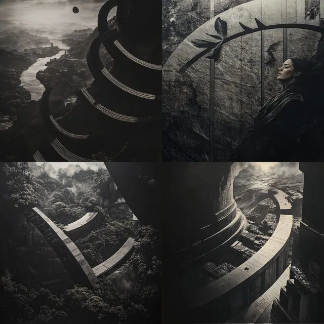 Монохромный архитектурный сюрреализм отличается созданием атмосферных и фактурных композиций, в которых резкие контрасты сочетаются с приглушёнными тонами. Сила этого стиля заключается в его способности вызывать ощущение изолированности и современности с помощью сложных геометрических структур и драматического освещения.