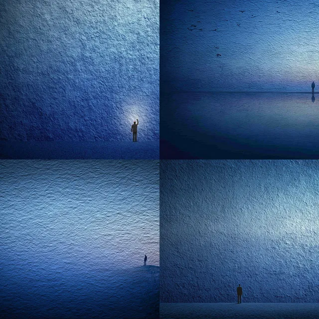 Преобладающая монохромная синяя палитра создаёт спокойную и созерцательную атмосферу. Текстурированные поверхности и многослойные композиции придают глубину, а одинокие фигуры вызывают темы изоляции и самоанализа. Постоянное использование синего цвета наполняет каждое произведение спокойным, но глубоким настроением. Несмотря на визуальную целостность, ограниченный цветовой диапазон может ограничивать универсальность этого стиля в более динамичных или красочных контекстах. Он идеально подходит для концептуального искусства и минималистичного дизайна, превосходно создавая атмосферные и интроспективные визуальные образы.