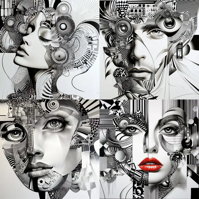 Монохромный геометрический сюрреализм завораживает своими замысловатыми узорами и высокой контрастностью, сочетая элементы оп-арта и сюрреализма. Стиль отличается чёткими линиями и динамичными композициями, которые создают оптические иллюзии, наполняя работы футуристическими и культурными мотивами. Хотя ограниченная цветовая палитра и не позволяет выразить всю цветовую гамму, визуальная глубина и ритмичные узоры создают уникальное повествование.