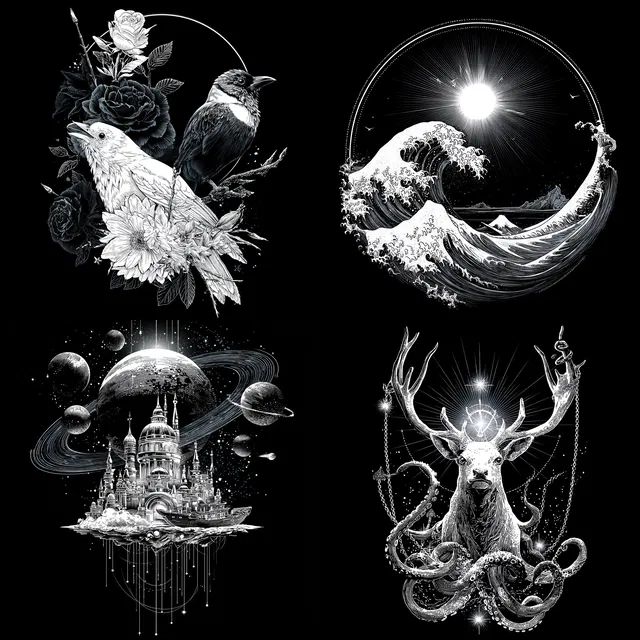 Стиль превосходно справляется с созданием сложных композиций с эффектом сна, что делает его идеальным для обложек книг, оформления альбомов и в модном дизайне. Однако его зависимость от монохрома может ограничивать универсальность в ситуациях, где требуются яркие цветовые палитры. Сложные детали и символические образы предлагают богатое визуальное восприятие, хотя и не всегда способны полностью передать фотореализм в фотографических контекстах.