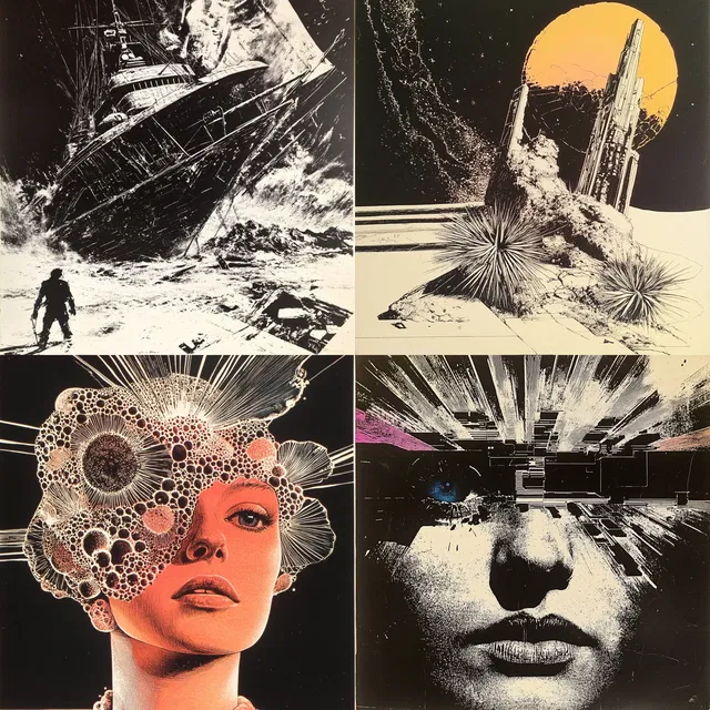 Футуристические и научно-фантастические темы в этом стиле неизменно выражаются через кибернетические и механические мотивы, а архитектурные элементы демонстрируют чёткое чувство структуры и пропорций.