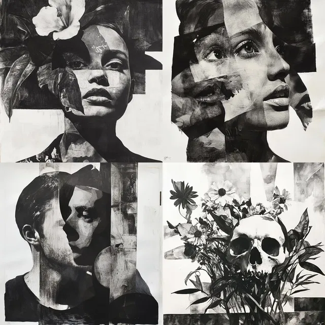Динамика монохромного коллажа завораживает смелым использованием техники коллажа, создавая многослойные и фрагментарные композиции, которые вызывают ощущение глубины и сложности. Динамичные макеты и энергичные структуры этого стиля напоминают влияние кубизма и сюрреализма, предлагая современный взгляд на авангардные течения XX века.