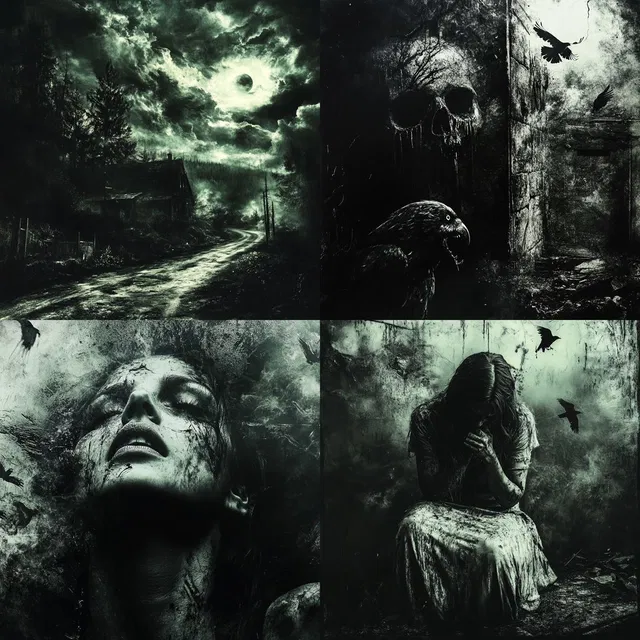 Этот стиль соткан из мрачной атмосферы и прекрасно справляется с созданием тревожных образов благодаря своей тёмной и монохромной палитре. Использование высокого контраста и драматического освещения усиливает настроение, вызывая чувство страха и опустошения. Текстурированные и многослойные дизайны привносят эстетику гранжа, а такие элементы, как черепа и руины, подчёркивают темы упадка и изоляции.