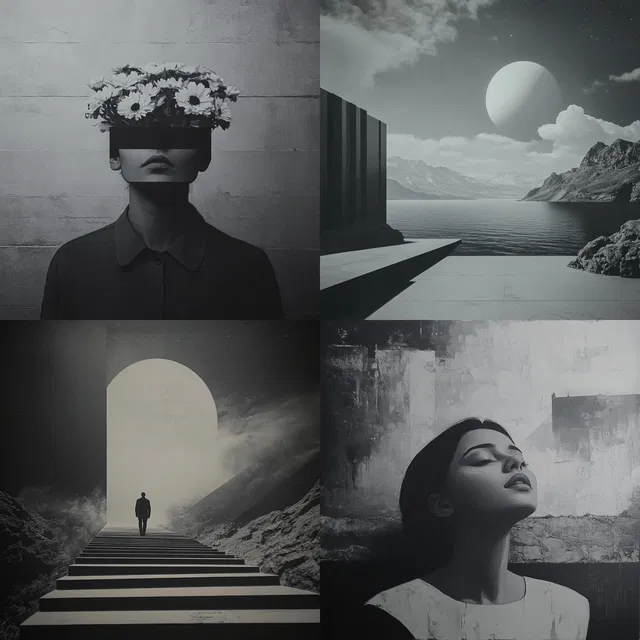 «Монохромная мечта» очаровывает своим поразительным использованием чёрно-белых изображений, создавая мир, в котором свет и тень вступают в драматическое взаимодействие. Этот стиль превосходно создаёт атмосферные сцены — будь то величественные архитектурные формы или интроспективные портреты. Его сюрреалистические нотки придают изображению сказочное качество, напоминая работы де Кирико и Магритта, но при этом сохраняя модернистский стиль.