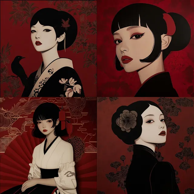 Использование плоских цветов и точных линий создаёт ощущение современного минимализма, а включение японских культурных мотивов придаёт воздушную элегантность традициям.