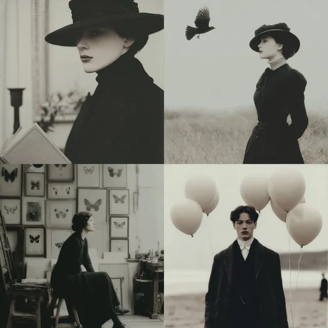 Стиль прекрасно передаёт вневременные образы и классическую манеру поведения, напоминая об эдвардианской эпохе. Приглушённая палитра и ненавязчивое повторение усиливают задумчивую неподвижность, что делает его идеальным для редакционной фотографии и исторических сюжетов. Однако зависимость от монохромии может ограничить его универсальность в более ярких или современных контекстах.