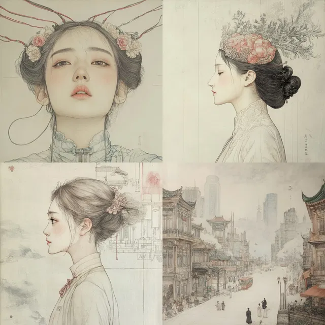 Этот стиль характеризуется тонкой линейной работой и мягкими пастельными тонами, которые вызывают чувство ностальгии и романтизма. Замысловатые детали и нежные цветовые палитры создают сказочную, эфемерную атмосферу, напоминающую об искусстве ар-нуво и викторианской эпохе.