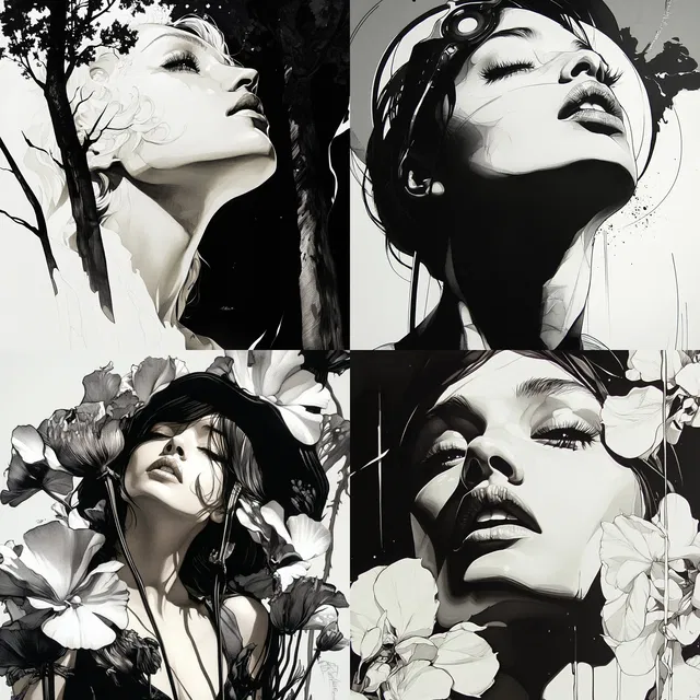 Преобладают выразительные чёрно-белые композиции с чёткими линиями и драматическим контрастом. Этот стиль отличается созданием динамичных и экспрессивных изображений с акцентом на плавные формы и органические очертания.