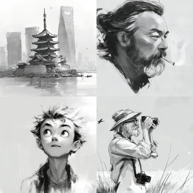 Этот стиль отличается монохромной элегантностью. Выразительные линии и динамичные мазки создают яркое повествование на разнообразные темы. Стиль отлично передаёт глубину характера и архитектурное величие, используя точность, напоминающую набросок, которая вызывает чувство ностальгии.