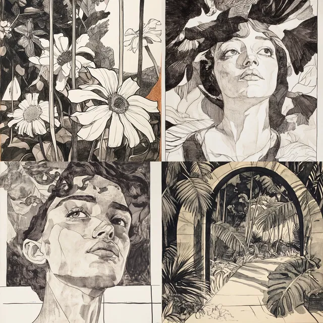 Этот стиль прекрасно подходит для передачи интроспективного и созерцательного настроения, что делает его идеальным для редакционных иллюстраций, обложек книг и модных дизайнов. Однако ему может быть сложно передать фотореализм и яркие цвета, что ограничивает его применение в более динамичных или красочных контекстах. Сила этого стиля заключается в способности передавать эмоциональную глубину и повествование через детальные и многослойные композиции.