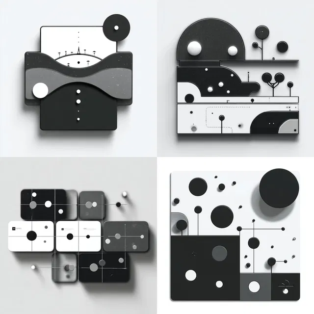 Преобладает монохромная элегантность с поразительным использованием чёрно-белого контраста и геометрической точности. Стиль отличается минималистичной эстетикой, создавая изящный, структурированный визуальный язык. Геометрические формы и монохромные палитры объединяют различные идеи — от архитектурных пейзажей до модного дизайна.