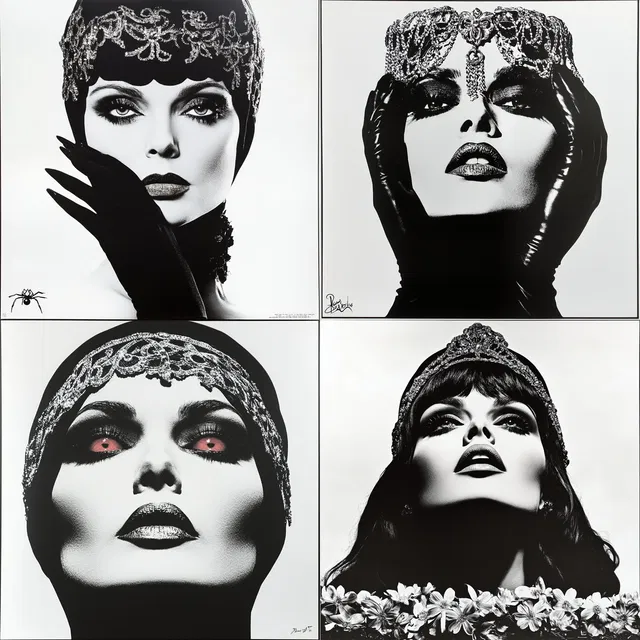 Преобладает монохромная элегантность, а высококонтрастные изображения создают драматическое напряжение в различных темах. Архитектурная точность и графическая насыщенность определяют облик городских пейзажей и футуристических сцен, а сложные детали и витиеватые украшения обогащают моду и дизайн персонажей.