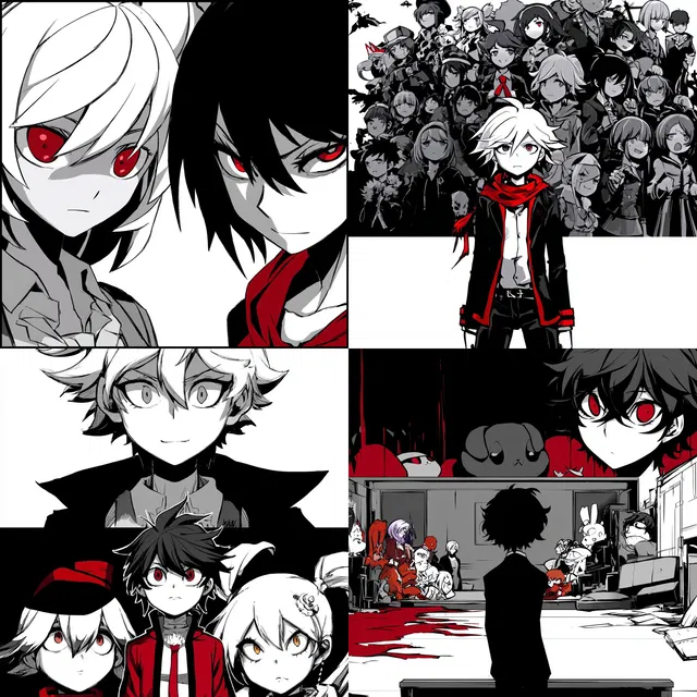 Поразительный визуальный стиль, отличающийся монохромной палитрой с яркими красными акцентами, создаёт драматическую и насыщенную атмосферу. Использование высокого контраста и толстых контуров придаёт работам динамичность и энергичность, напоминая эстетику манги и аниме. Выразительные линии и эмоциональные мазки передают глубину и эмоции, а многослойная композиция добавляет сложности и интриги.