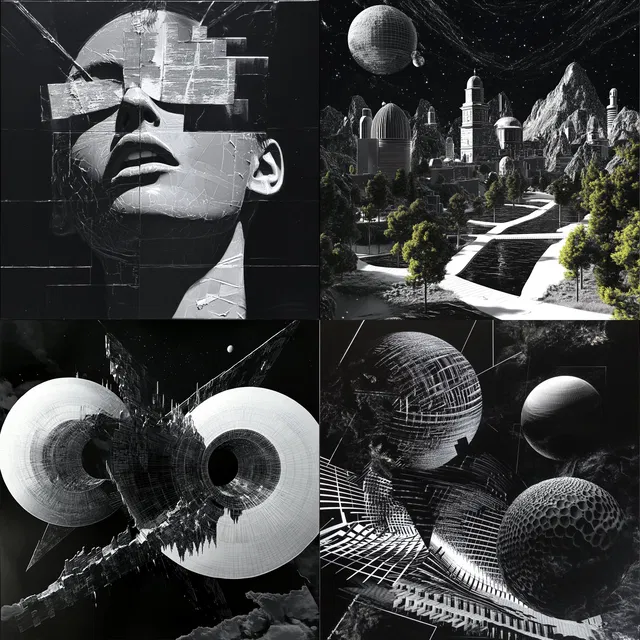 Этот стиль отличается монохромной палитрой и высокой контрастностью. Он идеально подходит для создания футуристических и сюрреалистичных пространств. Здесь преобладают геометрическая точность и многослойные текстуры, которые придают изображению глубину и сложность.