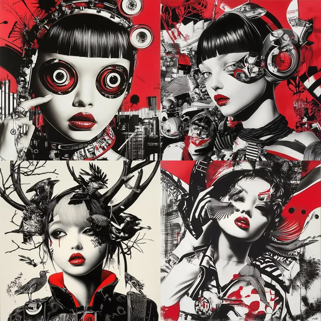 Выразительный визуальный стиль, который отличается смелыми контрастами и ограниченной цветовой палитрой с преобладанием монохрома и красных акцентов. Замысловатые механические текстуры и сюрреалистичные композиции создают футуристическую и сказочную атмосферу.