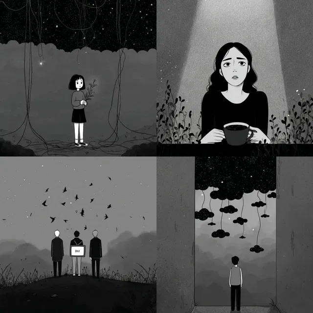 Преобладает монохромная элегантность с резкими контрастами и выразительными деталями, создающими меланхоличную атмосферу. Интроспективные персонажи и иллюстрации, основанные на повествовании, вызывают чувство экзистенциальных размышлений. Черно-белая палитра придаёт стилю неподвластную времени изысканность, но может не хватать яркости в ситуациях, где требуется цвет.