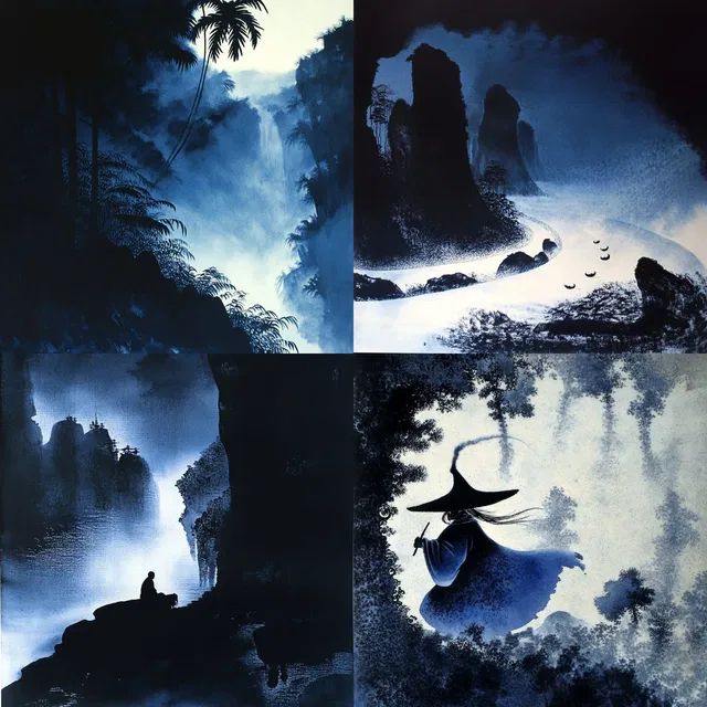 Видения Ethereal Ink завораживают гармоничным сочетанием традиционной японской эстетики и современного минимализма. В этом стиле преобладает монохромная палитра из глубоких синих и чёрных оттенков, создающая безмятежную, но таинственную атмосферу. Силуэты и негативное пространство мастерски используются, чтобы вызвать чувство спокойствия и самоанализа.