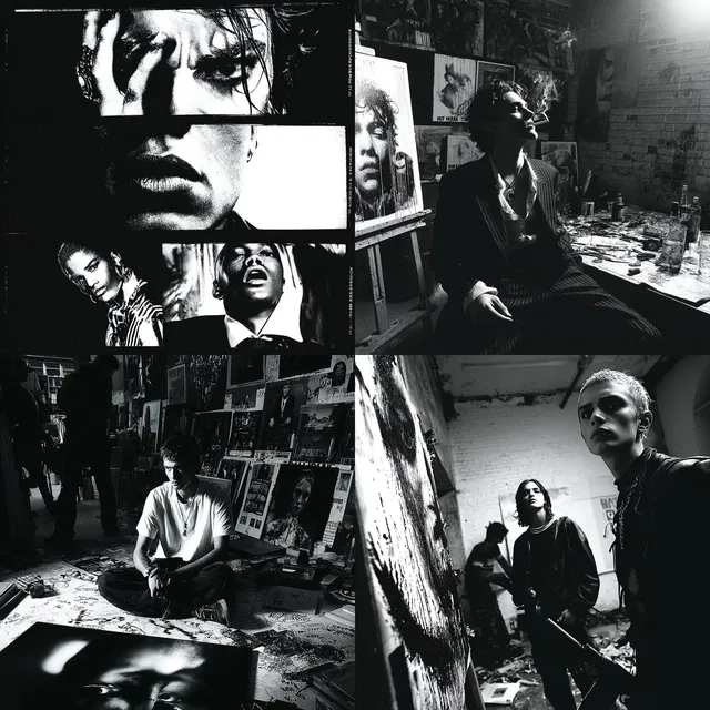Преобладает монохромная элегантность: высокий контраст и драматичное освещение создают атмосферу в стиле нуар. Выразительные персонажи и насыщенные городские пейзажи пробуждают чувства ностальгии по ретро и винтажу. Текстурные детали и сложные поверхности добавляют глубину, а динамичные композиции и смелая типографика усиливают визуальный эффект.