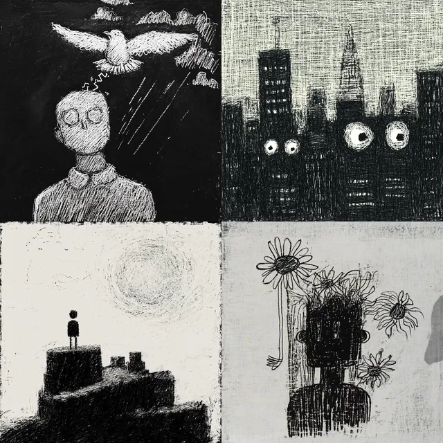 Отличительный визуальный стиль, характеризующийся монохромностью, шероховатыми текстурами и выразительными линиями, которые вызывают ощущение мрачной ностальгии. Этот стиль отлично подходит для создания атмосферных, интроспективных сцен с сюрреалистическими, авангардными элементами. Его сильная сторона — применение в редакционной и иллюстративной сферах, где уникальная эстетика может усилить глубину повествования. Однако ему может быть сложно справиться с фотореализмом и динамическим 3D-рендерингом, что ограничивает его универсальность в определённых контекстах. Идеален для проектов, в которых требуется создать запоминающееся, загадочное визуальное повествование.