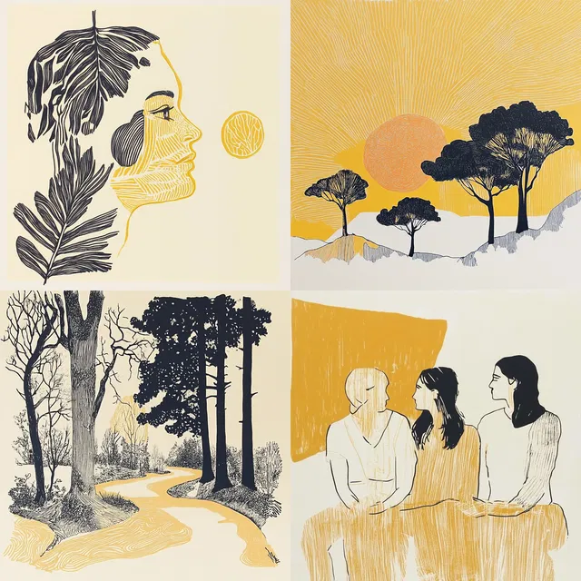 Использование приглушённого жёлтого, мягкого чёрного и кремового бежевого цветов создаёт сдержанную, но выразительную палитру, которая усиливает спокойное и умиротворённое настроение.