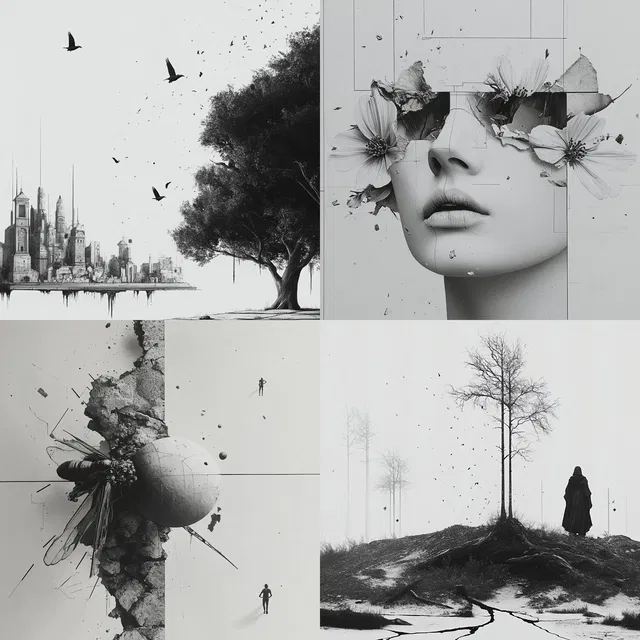 Этот визуальный язык отлично подходит для редакционного дизайна и концепт-арта, предлагая уникальное сочетание сюрреалистической абстракции и классического реализма. Однако зависимость от монохромности может ограничить его привлекательность в ситуациях, где требуются яркие цвета.