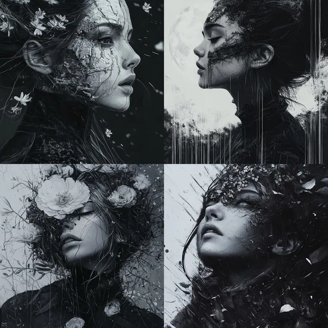 Монохромная элегантность определяет этот стиль, где серая утончённость и текстурная глубина создают завораживающую, неземную атмосферу. Замысловатые композиции и многослойные текстуры вызывают ощущение сюрреализма, исследуя темы изоляции и самоанализа.