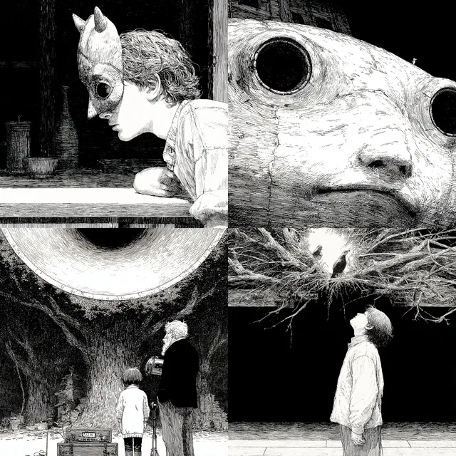 Замысловатые линии и строгий монохром определяют этот стиль, создавая призрачную, сюрреалистичную атмосферу. Мелкий перекрёстный штриховкой и детальный офорт создают текстурную глубину, которая усиливает жуткую тишину и таинственную обстановку. Выразительные глаза и пристальные взгляды придают портретам эмоциональную глубину, а архитектурные формы и механические существа намекают на антиутопический сюжет. Несмотря на визуальную насыщенность, этому стилю может не хватать яркости в приложениях, ориентированных на цвет. Зато он прекрасно подходит для графических романов, иллюстраций в жанре тёмного фэнтези и атмосферных историй.