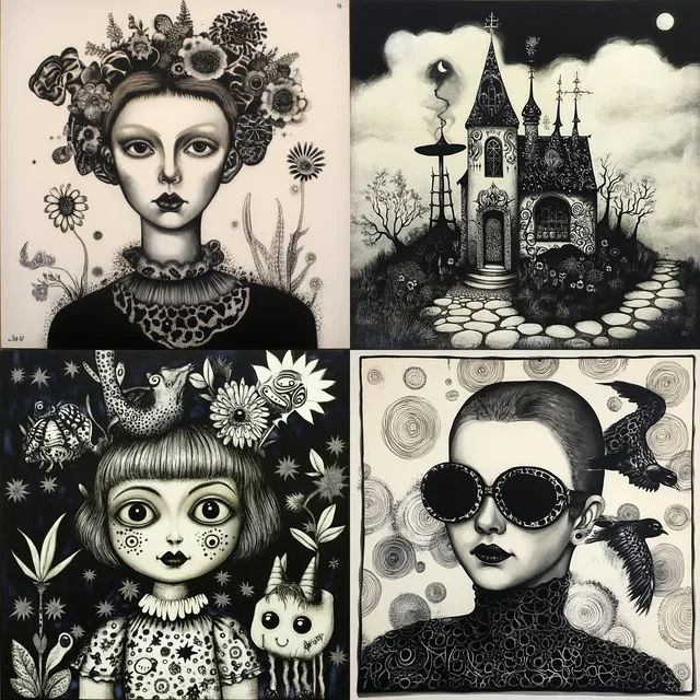 Преобладает монохромная элегантность, замысловатые линии и сюрреалистичные мотивы создают жутковатую, причудливую атмосферу. Этот стиль отлично передаёт фантастические и сказочные элементы, напоминая о влиянии готики и викторианской эпохи. Детальные текстуры и выразительные персонажи усиливают сюрреалистичность повествования, что делает его идеальным для книжных иллюстраций и концепт-арта. Однако отсутствие цвета может ограничить его применение в ярких контекстах, а замысловатые дизайны могут не подойти для минималистичных решений.