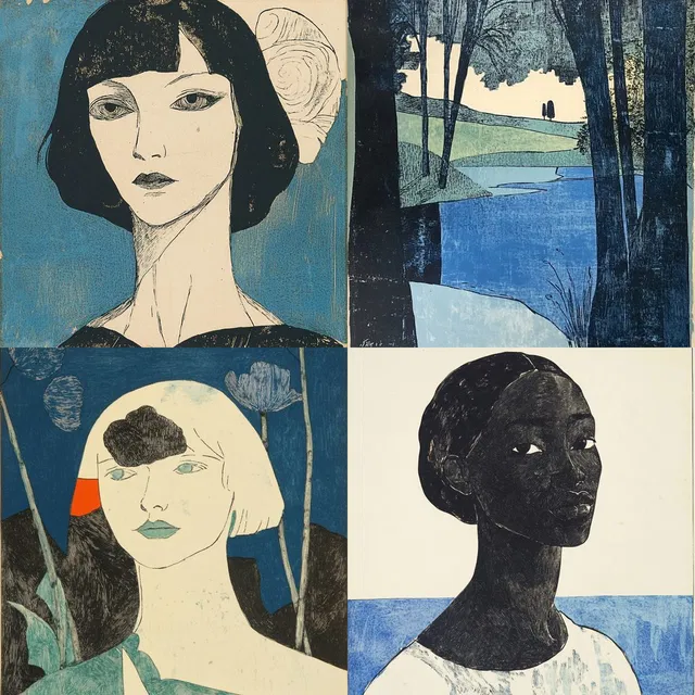 В этом стиле ярко выражены синие тона. Графические линии сочетаются с текстурированными поверхностями, создавая современное и вневременное визуальное повествование. Композиции часто основаны на балансе и минимализме, они притягивают взгляд зрителя благодаря замысловатым узорам и смелым контрастам.