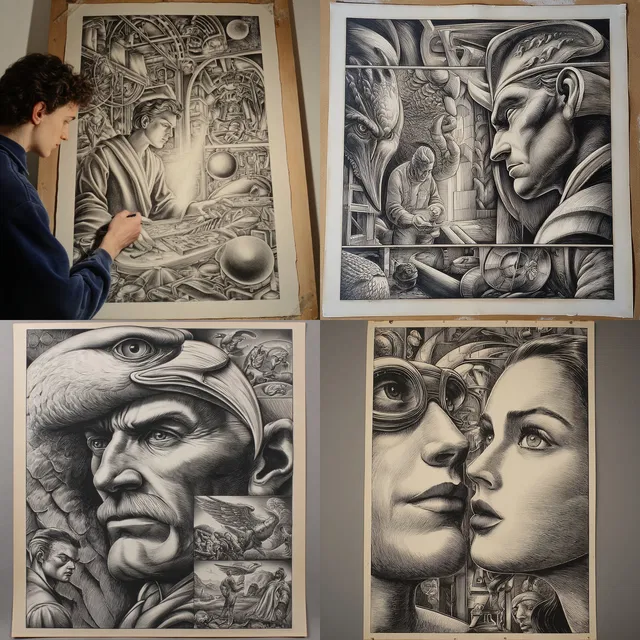 Сложные линии и драматическое светотеневое моделирование определяют этот стиль, объединяя влияние сюрреализма с архитектурным величием. Монументальные сооружения и выразительные портреты занимают доминирующее положение, создавая атмосферу напряжения. Монохромная палитра подчёркивает замысловатые детали, а композиции вызывают ощущение эпического масштаба и глубины повествования.