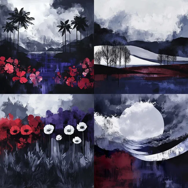 Слияние в стиле муди-экспрессионизм завораживает глубокими атмосферными оттенками и выразительной манерой письма, создавая драматическое взаимодействие света и тени. В этом стиле современные и классические элементы объединяются, часто используется ограниченная цветовая палитра с преобладанием синего, фиолетового и красного цветов.