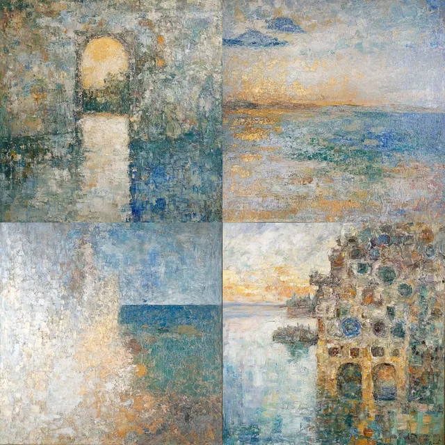 Текстурированные мозаичные пейзажи создают ощущение неземной красоты благодаря своим импрессионистическим и мозаичным характеристикам. Использование приглушённых цветов и мягкого освещения в этом стиле создаёт мечтательное, атмосферное настроение, напоминающее художественные течения начала XX века, такие как импрессионизм и модерн. Многослойные и абстрактные элементы дизайна придают структуре ощущение текучести, позволяя по-разному интерпретировать темы ностальгии, футуризма и фэнтези.